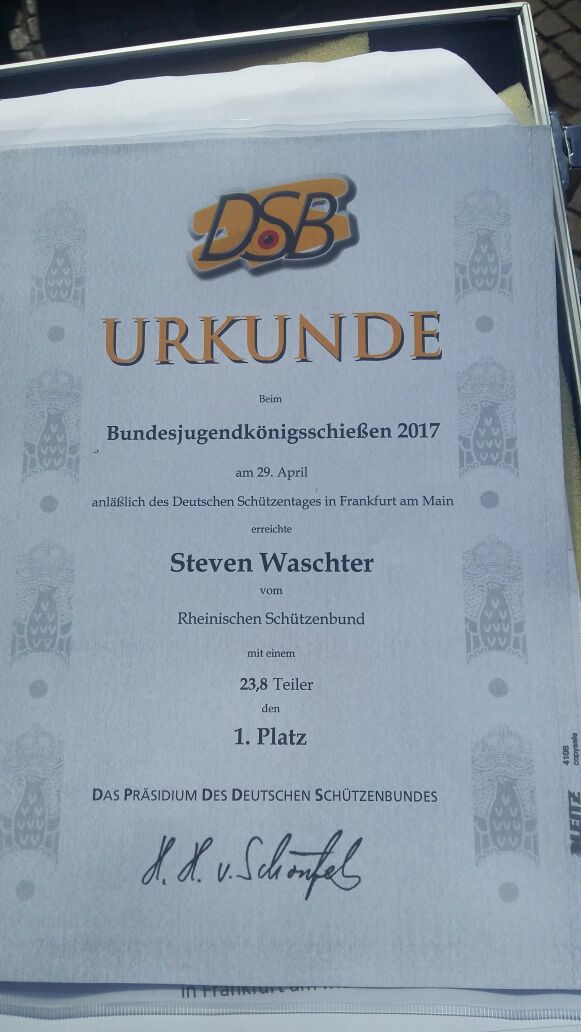 Gegen sehr starke Konkurrenz setzte sich Steven mit einem Teilerwert von 23,8 durch. Die Delegation des Rheinischen Schützenbundes (RSB) war außer sich vor Freude. Mit erstaunlichem Prophetentalent scheint der Präsident, Willi Palm, des RSB gesegnet zu sein. Am Vorabend des Bundeswettbewerbs erklärte er, “Der Junge ist cool, der hat Chancen!”